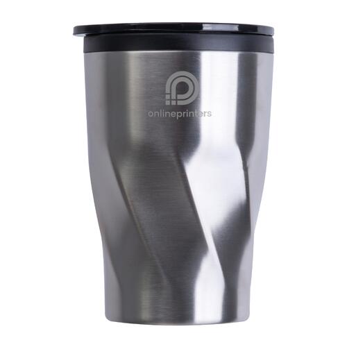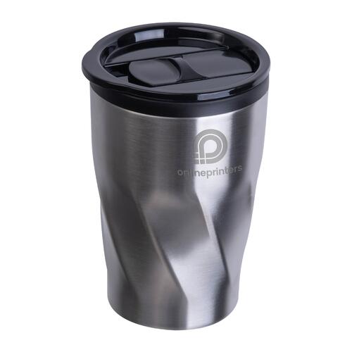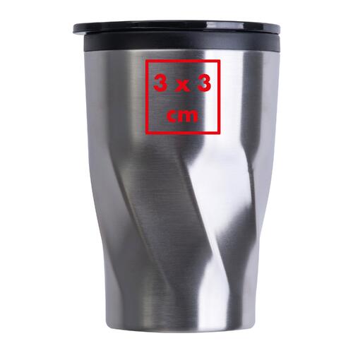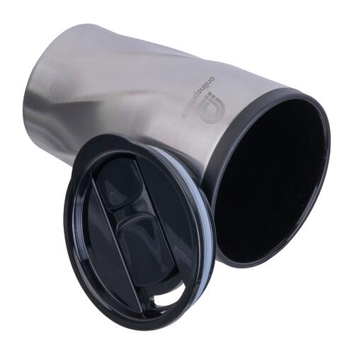 - Tazza termica a doppia parete con corpo in acciaio inox e interno in plastica (PP), dotata di coperchio con chiusura scorrevole