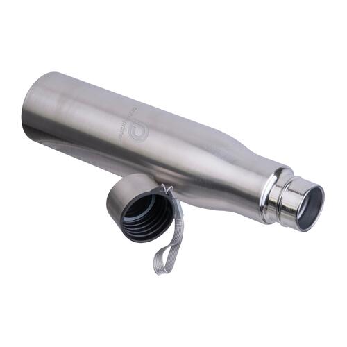 - Borraccia monostrato in acciaio inox 304 riciclato con maniglia sul tappo e capacità di 900 ml
