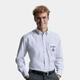 - colletto button-down, taschino a sinistra, carré posteriore con due pince inserite lateralmente, pince posteriore con cucitura posteriore; polsini obliqui regolabili con due bottoni, orlo arrotondato