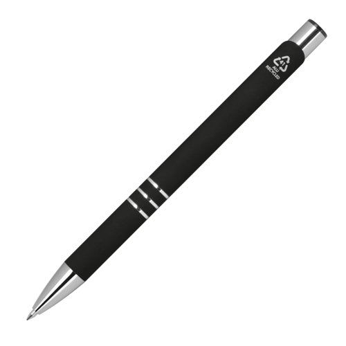 - Penna semigel in alluminio riciclato con superficie gommata e ricarica di grande capacità con scrittura blu (punta semigel da 0,7 mm)