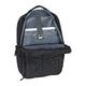 - Dispone di due tasche frontali con cerniera, un ampio scomparto principale con imbottitura per laptop, diverse tasche interne, spallacci imbottiti, manico e una fascia per il fissaggio al trolley